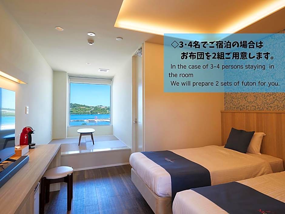 The quadruple room includes a private bathroom, well-fitted with a bath, a shower, a bidet, a hairdryer and slippers. The air-conditioned quadruple room offers a flat-screen TV, tatami, a wardrobe, an electric kettle as well as sea views. The unit has 2 beds and 2 futons.